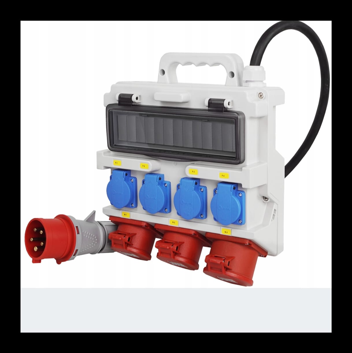 Rozdzielnica charakteryzuje się wysoką jakością wykonania oraz odpornością na warunki atmosferyczne.Gniazda siłowe 5-polowe, posiadają styki niklowane, dzięki czemu nie utleniają się oraz nie przegrzewają. Ma to wpływa na odporność przeciążeniowo- prądową, co wpływa bezpośrednio na BEZPIECZEŃSTWO.Rozdzielnica posiada wtyczkę zasilającą, siłową 32A 5P, umocowaną na przewodzie gumowym H07RN-F 5×4,0mm2, o długości 1m.